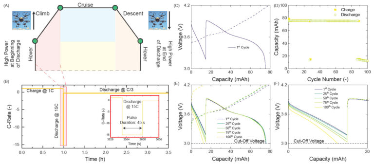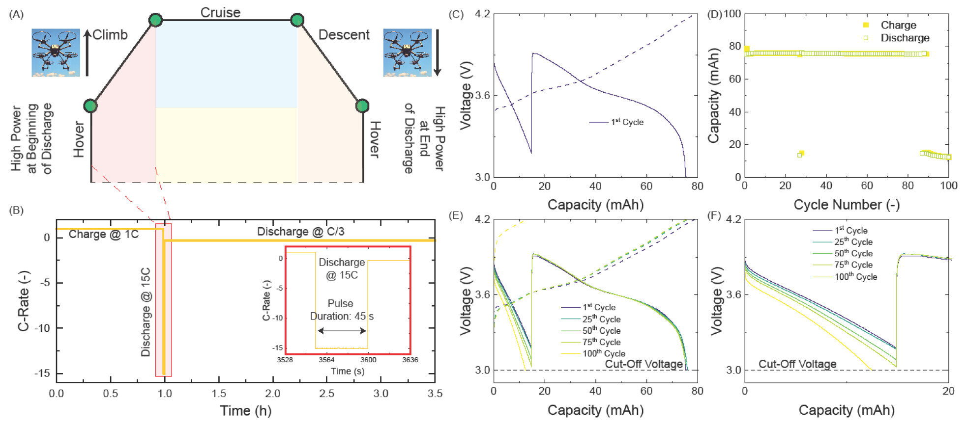 High power requirements in eVTOL load profiles and electrochemical behavior of lithium-ion batteries under simulated takeoff step. (A) Schematic diagram showing major segments of an eVTOL mission profile and the corresponding power requirements. We are interested in evaluating the behavior of lithium-ion batteries within the initial high-power segment of takeoff. (B) Current profile for the testing carried out in this study. Cells are charged at a nominal 1C rate until a full state-of-charge is achieved (4.2 V cutoff). At the beginning of discharge, a current pulse equivalent to 15C is applied for 45 s. Subsequent discharge is carried out at a nominal C/3 current. For the batteries investigated here, 1C corresponds to ∼0.08 A, and 15C corresponds to roughly 1.2 A. (C) First charge–discharge cycle polarization curve with the dotted line showing the charge cycle and solid line depicting the discharge cycle. (D) Capacity retention of the cell over extended cycling under the simulated climb step discharge protocol. (E) Complete polarization curves and (F) zoomed in plot of the polarizations within the 15C discharge pulse segment for the 1st, 25th, 50th, 75th, and 100th cycles. The cut-off voltage of 3 V is identified by a dashed line in (E) and (F). Credit: ACS Energy Letters (2024). DOI: 10.1021/acsenergylett.3c02385
