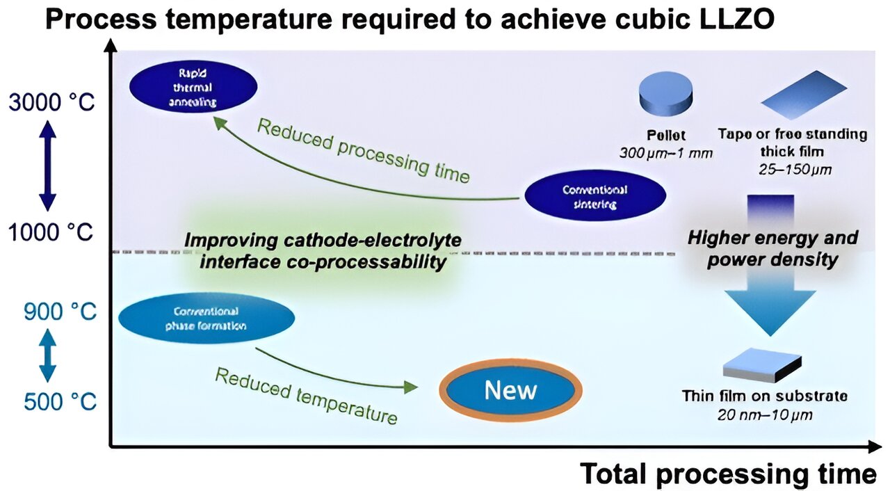 Based on the insights they gained into the crystallization process, they developed a route by which cLLZO is obtained as a dense, solid film after 10 hours of annealing at the relatively low temperature of 500°C—with no sintering. For future battery designs, this method will allow for the integration of the solid LLZO electrolyte with sustainable cathodes that could avoid the use of socioeconomically critical elements such as cobalt.