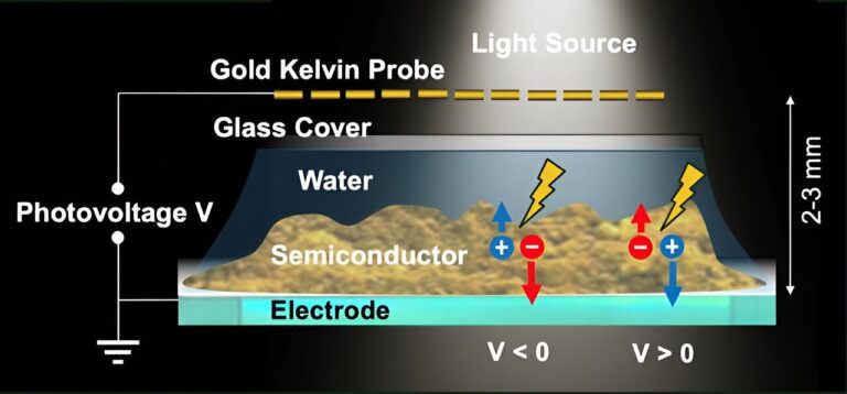 Here, the team shows that the photovoltage of such solar fuel electrodes can be measured in a contactless way. They did so by using a so-called gold Kelvin probe that hovers over the illuminated device and picks up the information through space.