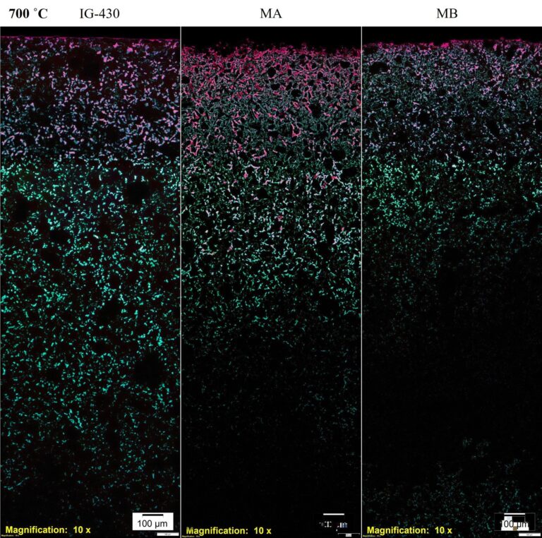 Nassia’s team focused their study on superfine grained graphite with an average grain size of 10–20 micrometers, because these are being considered for the next generation reactors. Using a high-temperature furnace and a carefully controlled atmosphere, four grades of superfine grained graphite were oxidized at 700–800 °C.