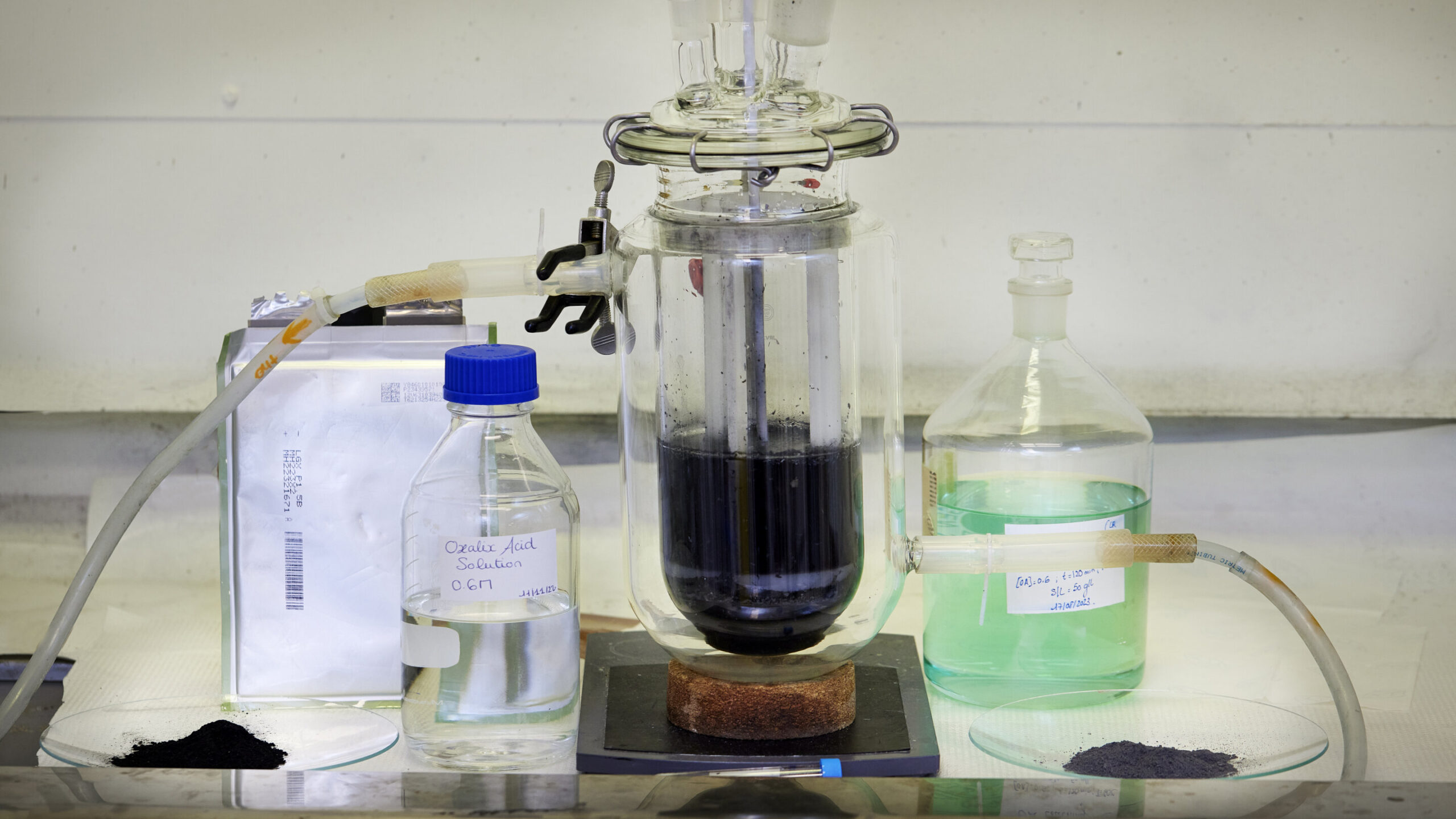 In Chalmers’ battery recycling lab, Rouquette and research leader Martina Petranikova show how the new method works. The lab has spent car battery cells and, in the fume cupboard, their pulverized contents. This takes the form of a finely ground black powder dissolved in a transparent liquid—oxalic acid.
