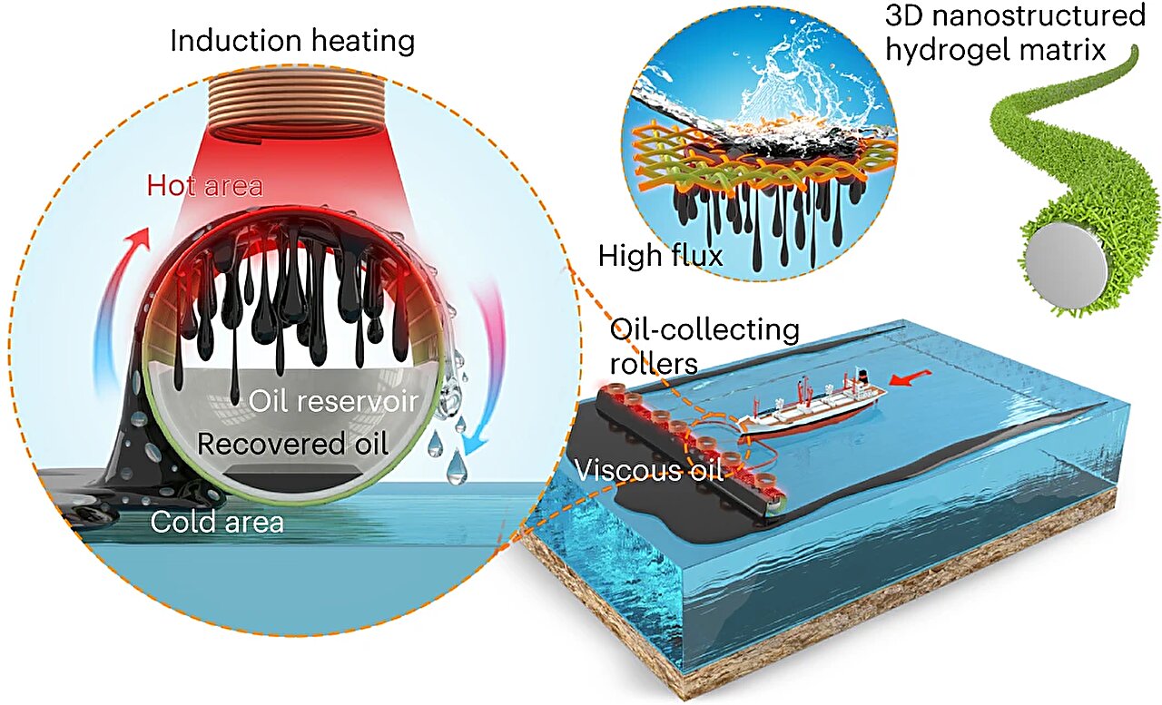 The new technology uses a dual-layer mesh roller coupled with an induction heating technique, with material properties that allow it to separate oil from water and then remove that oil from the ocean with high efficiency and throughput. In experiments, the researchers showed the potential to retrieve up to 1,400 kilograms of viscous oil per square meter per hour, which is about 10 times better than the way oil is cleaned up today.