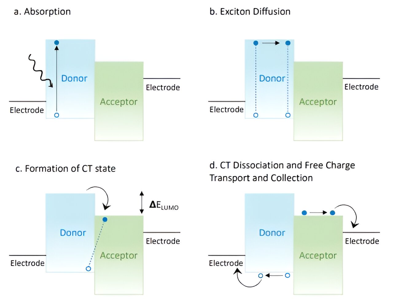 Schematic diagram illustrating the main steps for generation of photocurrent in an OPV. a) photon absorption and formation of an exciton, b) exciton diffusion to the heterojunction, c) Exciton dissociation (via CT state) into free charges at the interface, d) charge transport in the domains and charge collection by the electrodes. Credit: https://kau.diva-portal.org/smash/get/diva2:1749633/FULLTEXT02.pdf