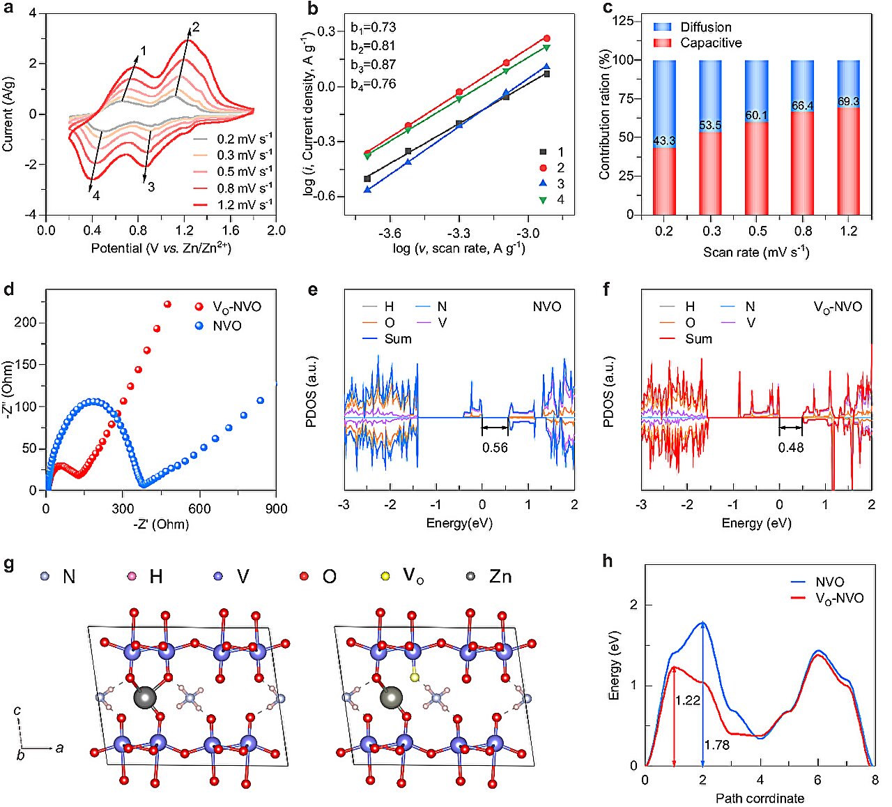 Generating oxygen vacancies into the NVO lattice can accelerate the ion and charge transfer kinetics, reduce the diffusion barrier of zinc ions, and establish a stable crystal structure during zinc ion (de-intercalation). This defect engineering also facilitates the enhancement of the surface capacitive contribution of NVO due to the higher electrochemical surface reactivity and lower required number of formation electrons.