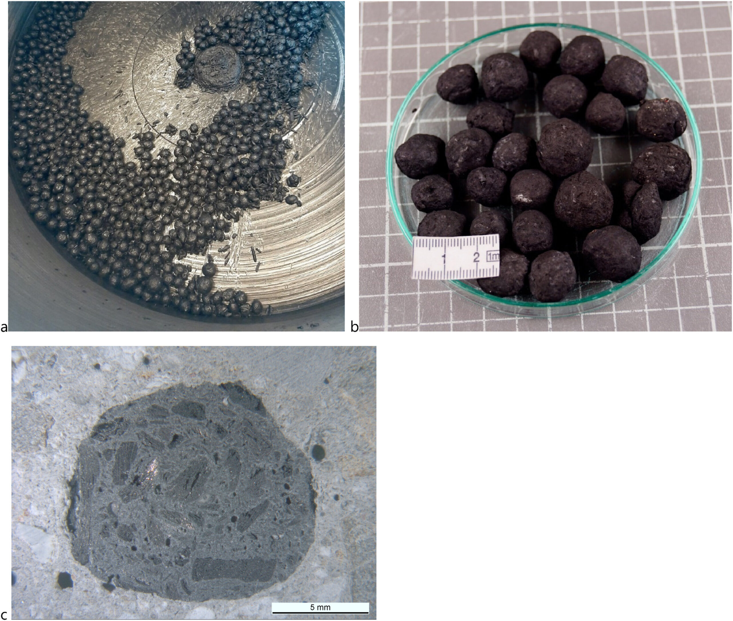 To produce the pellets, the team used a concrete mixer with a rotating pan in which they mixed the biochar with water and cement and, as a result of the rotation, obtained small pellets with a diameter of between 4 and 32 millimeters. In turn, they used these pellets to produce normal concrete of strength classes C20/25 to C30/37—the classes that are most widely used in civil engineering today.