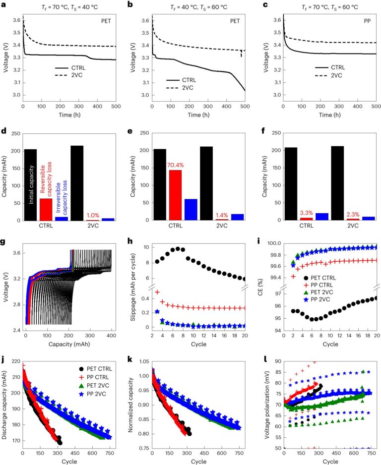 Demonstration of improvements in self-discharge and cycling performance when PP tape is used instead of PET tape. a–c, Voltage versus time profiles of LFP–graphite pouch cells with PET tape formed at TF = 70°C and stored at TS = 40°C (a), with PET tape formed at 40°C and stored at 60°C (b) and with PP tape formed at 70°C and stored at 60°C (c). d–f, The corresponding bar graphs (d–f) show initial capacity, reversible capacity loss and irreversible capacity loss. g–i, UHPC cycling profiles (g), charge endpoint capacity slippage (h) and Coulombic efficiency (CE) (i) for LFP–graphite cells with either PET or PP tape. Cells were formed at 70°C and transferred to the UHPC system at 50% SOC. All UHPC data were recorded at C/20 and 40°C from 2.5 to 3.65 V. The CTRL electrolyte was 1.5 M LiPF6 in EC:DMC (3:7). CTRL electrolyte with 2% VC is marked as 2VC. j–l, Discharge capacity (j), normalized capacity (k) and the voltage polarization (l) of LFP–graphite pouch cells with either PP or PET tape, formed at 40°C and cycled at 70°C with a current of C/3. The CTRL electrolyte was 1.5 M LiFSI in EC:DMC (15:85). CTRL electrolyte with 2% VC is abbreviated to 2VC. Credit: Nature Materials (2023). DOI: 10.1038/s41563-023-01673-3