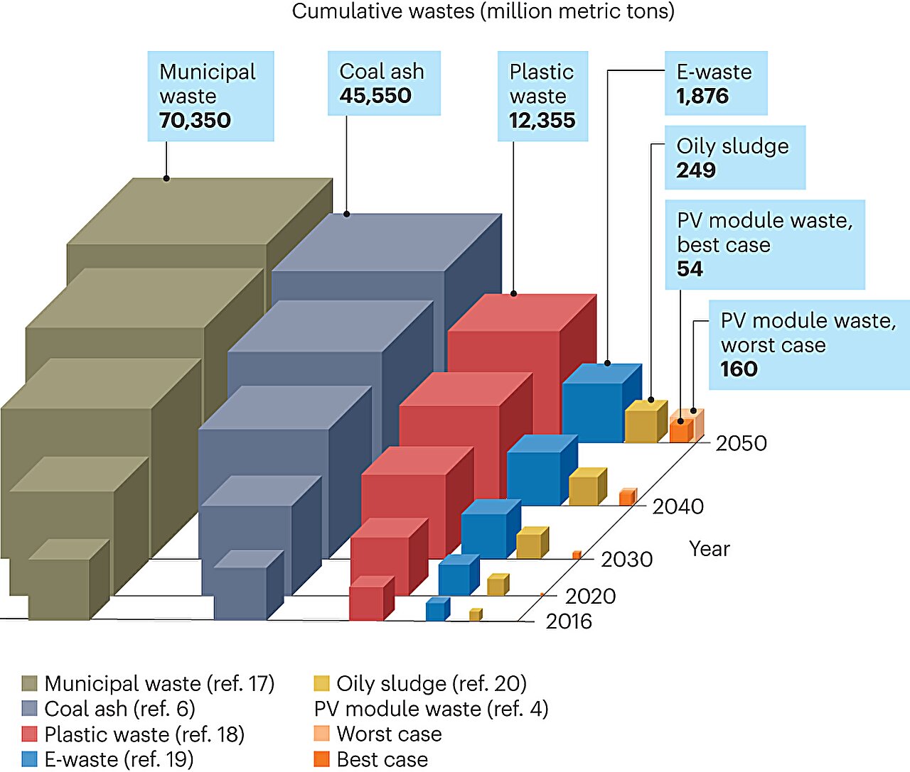 Global cumulative wastes from 2016 to 2050. Credit: Nature Physics (2023). DOI: 10.1038/s41567-023-02230-0