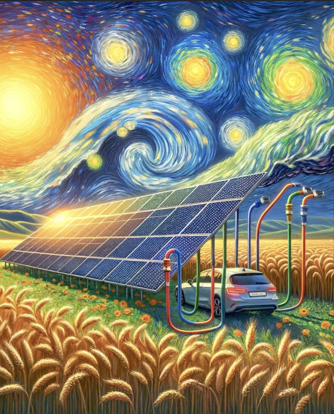 Photoelectrochemical solar hydrogen production panels showing H2 is used for fueling the FCEV vehicles. Credit: Dr. Dharmesh Hansora