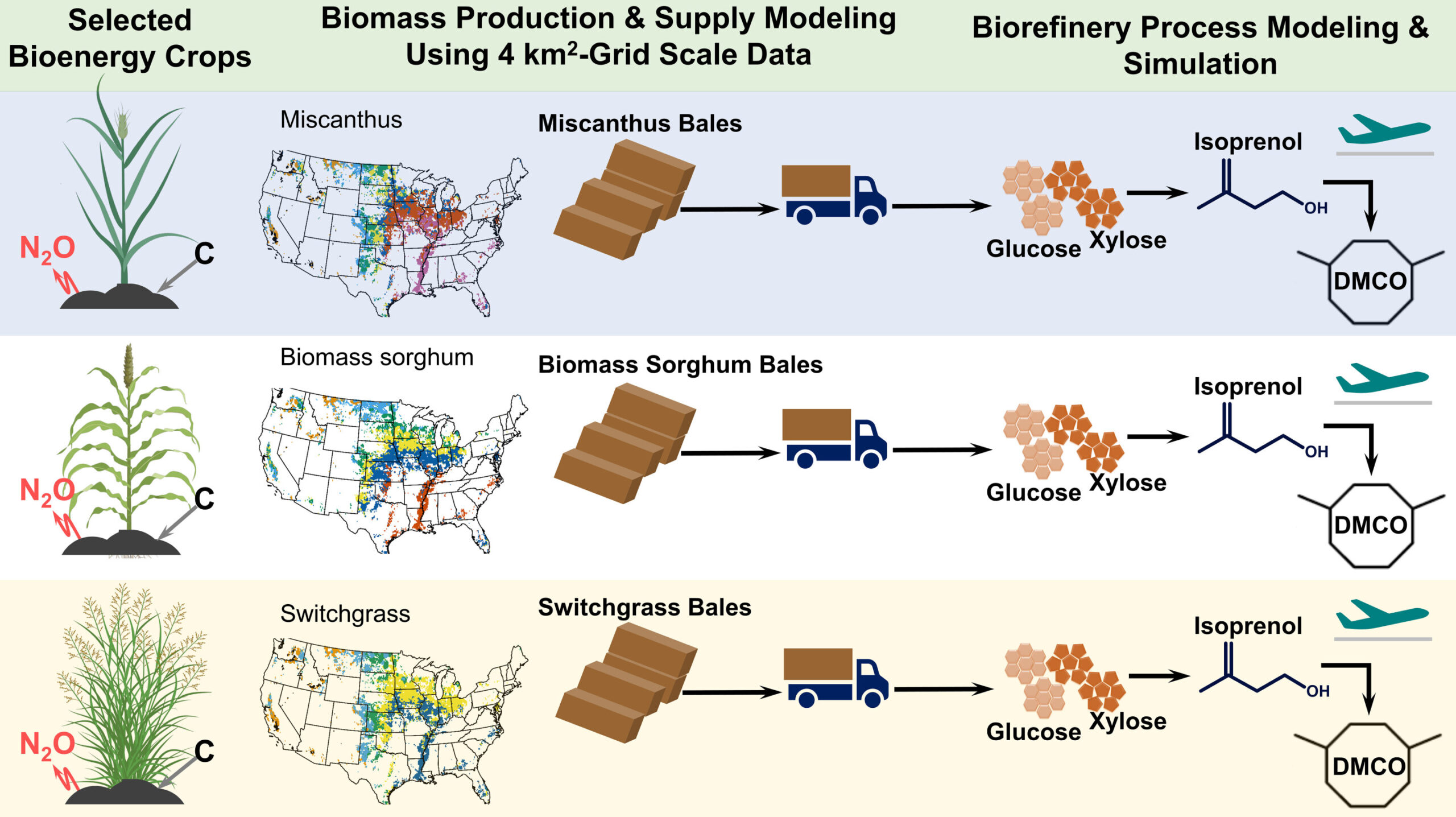 There are several candidates to consider as the starting plants for SAF production. The JBEI analysis examines the potential of three high-yielding biomass crops—Miscanthus, sorghum, and switchgrass—to provide feedstocks for commercial-scale production of SAF. Simulation and modeling explored the interplay and tradeoffs between bioenergy, production volume, carbon removal, and fuel prices. Scientists selected the feedstocks for the study because all three can be grown without irrigation on farms across the United States, and can be readily converted into high-performance dimethylcyclooctane jet fuel.