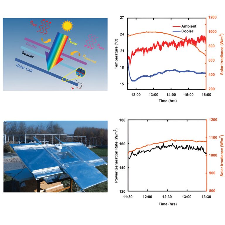 Underneath the radiative cooler, the researchers positioned a solar panel, so that during daylight hours, the sunlight passes through the transparent radiative cooler and is absorbed into the solar cell to generate electricity.