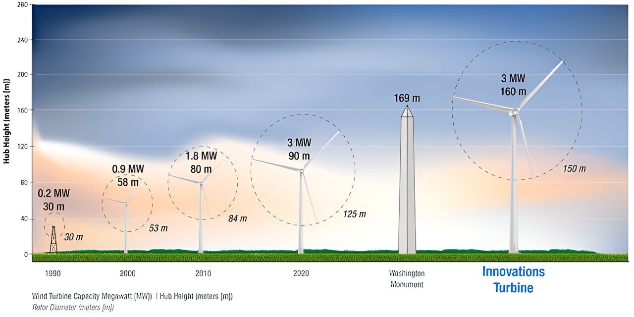 - Taller towers. Stronger winds exist at higher hub heights, beyond the reach of today’s typical turbines. An average 17-meter increase in height provides the additional clearance needed for longer blades to reach those high-altitude winds.