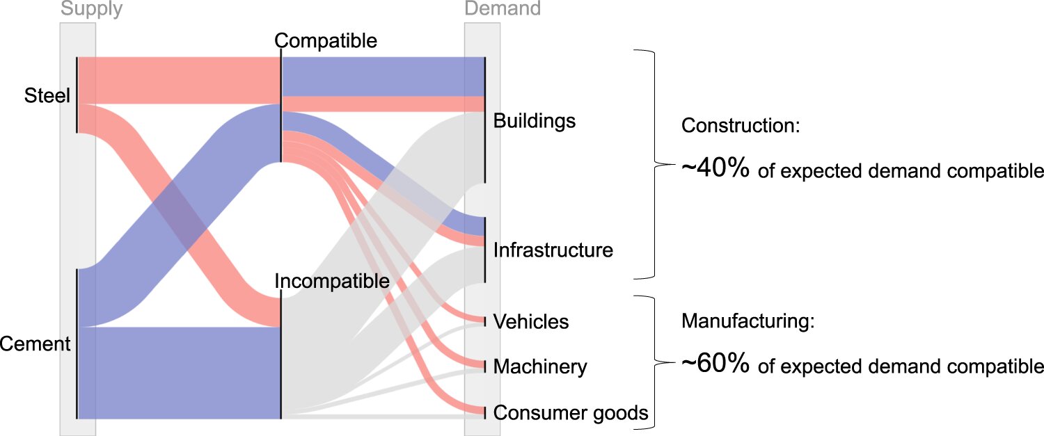 Assuming infrastructure deployment based on historical trends and current construction plans, the study goes on to further show that the supply of steel and cement in line with carbon budgets based on the Paris Agreement will not meet demand.