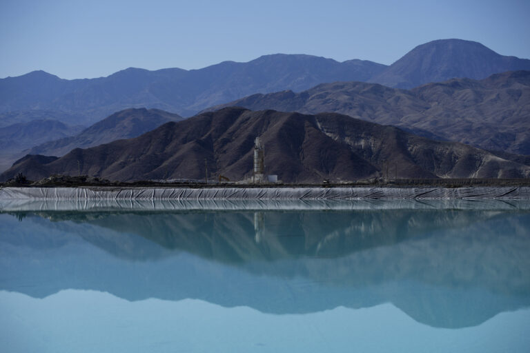 A truck drives past brine evaporation ponds at Albemarle Corp.’s Silver Peak lithium facility, on Oct. 6, 2022, in Silver Peak, Nev. Threatened by possible shortages of lithium for electric car batteries, automakers are racing to lock in supplies of the once-obscure “white gold” in a politically and environmentally fraught competition from China to Nevada to Chile. Credit: AP Photo/John Locher, File