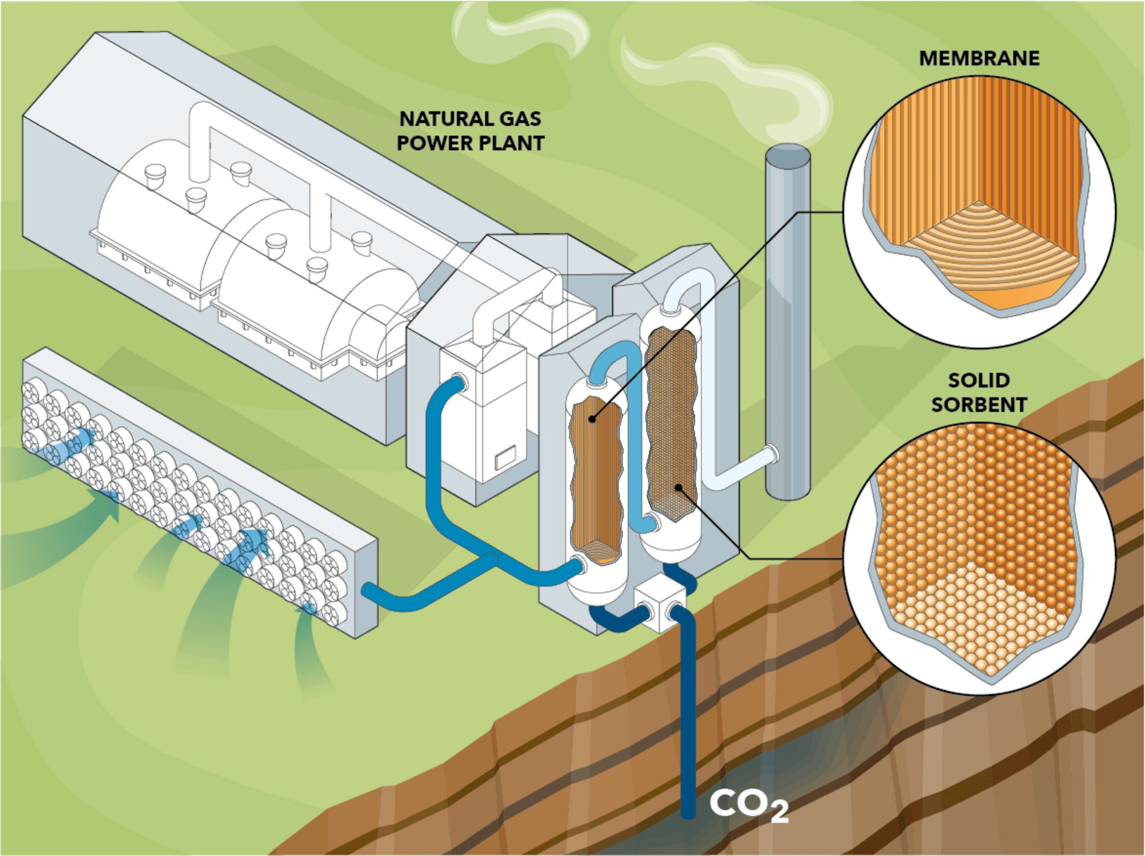 They modeled a hybrid carbon capture system that attaches to an NGCC power plant and consists of a membrane and solid sorbent systems. For the solid sorbent system, the team modeled fixed bed absorbers packed with metal-organic framework (MOF) solid sorbents that absorb CO2 and undergo temperature swing desorption using steam from the power plant.