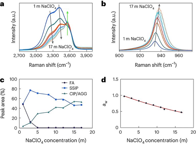Physical properties of electrolytes as a function of NaClO4 concentration. a, OH-stretching vibration of water. b, ClO4− symmetric stretching vibration. c, Speciation of CIPs/AGGs (green triangles), FAs (purple circles) and SSIPs (blue squares) derived from b. The solid lines are guides for the eye. d, aw as a function of NaClO4 concentration derived from ref. The red line represents the third-order fit of the data. The arrows in a and b point in the direction of increasing electrolyte concentration. The gray arrows and green arrow in a indicate vibrations associated with H-bonded water and ion-solvated water (that is isolated water), respectively. Credit: Nature Catalysis (2023). DOI: 10.1038/s41929-023-01010-6