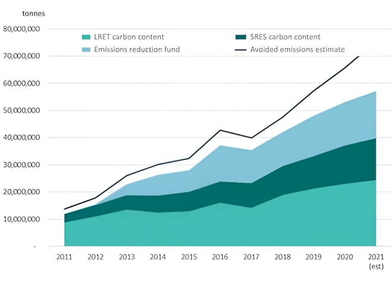 Between 2011 and 2021, the RET accounted for more than half of Australia’s greenhouse gas abatement, delivering by 2021 40 million metric tons (Mt) out of about 75 Mt. Over a decade that’s the equivalent of retiring two very large coal-fired power stations each year (see chart below).