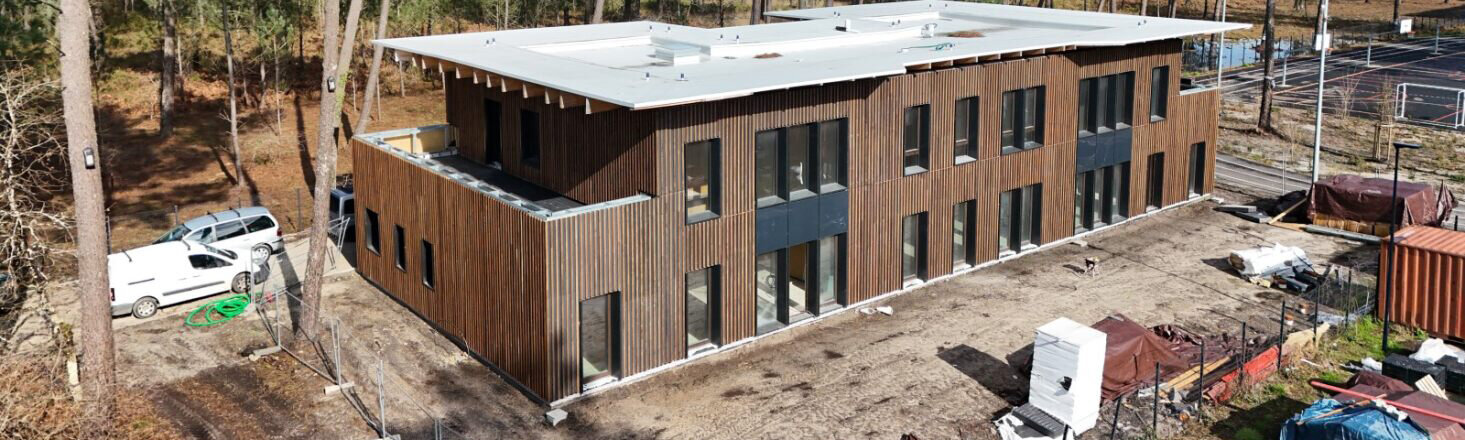 The flagship result of the initiative is a wooden apartment building that is located adjacent to the Pian-Médoc school and will house some staff members. The two-story structure with 16 flats highlights how forest resources can aid rural areas, be sustainably managed, and help green the construction industry.