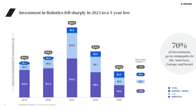 The data from an investment report by F-Prime, the venture capital arm of Fidelity Investments, shows that 2021 was a great year to be raising capital for a robotics startup, with $18.1 billion raised in a low-interest stimulus-for-everyone Covid environment. That dropped by a third in 2022 to $12.4 billion, and dropped yet another third last year to just $7.4 billion.