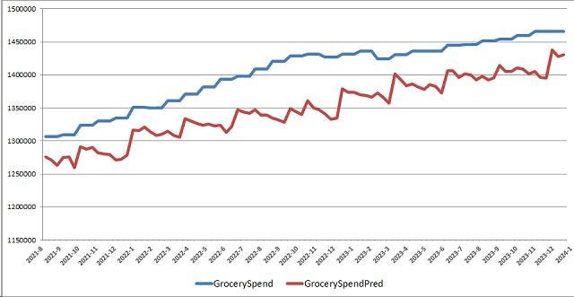 In fact, when 1-period advance predictions are considered (e.g., predictions for December 2023 based on data available through November 2023), the margins of errors (percentage differences between actual and predicted consumer spending) were as low as 0.16% for Groceries and 1.43% for Electronics.
