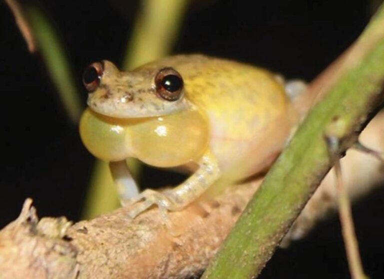 • It mates during the rainy season, between November and May. “Large choruses of breeding males were found after two or more days of consistently heavy rainfall,” state the researchers. “Males call while perched on shrubs and tiny trunks in or near large ponds formed by river flooding and small ponds formed by accumulation of rainwater in low-lying areas. We found as many as three calling males sharing the same shrub.”