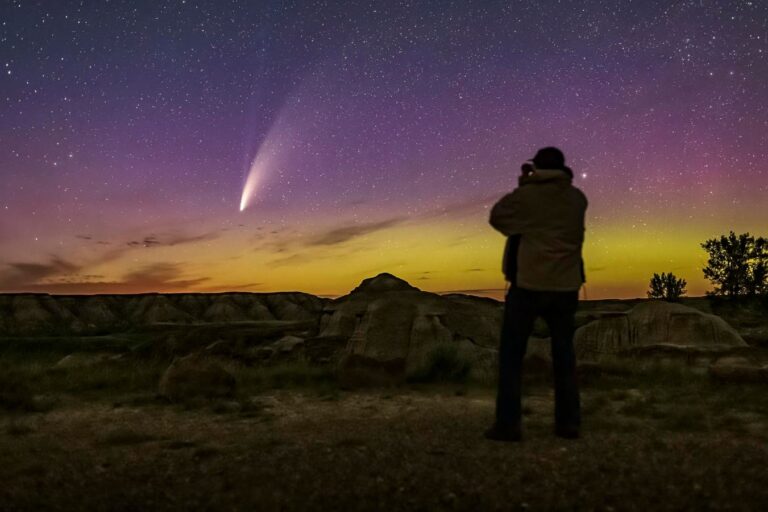 It’s moving through the constellations Andromeda and Pisces, which are visible in the western sky immediately after sunset, but only for a few hours.