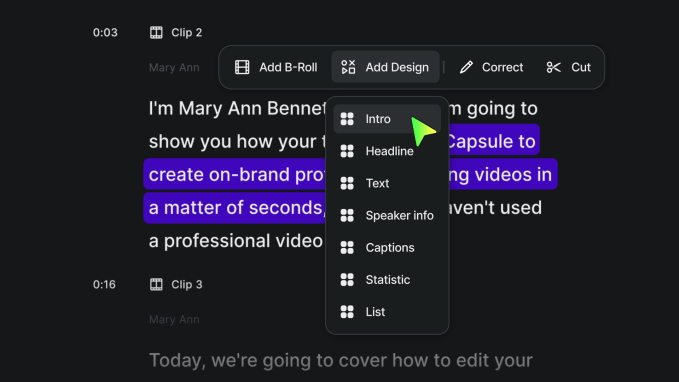 Since raising its $4.75 million round earlier this year, Capsule was rebuilt, adding dozens of new features and performance updates aimed at helping enterprises create video at scale. Users can now easily add text and motion graphics without formal editing experience, says Capsule, and can lean on AI to generate components like headlines and images for B-roll.