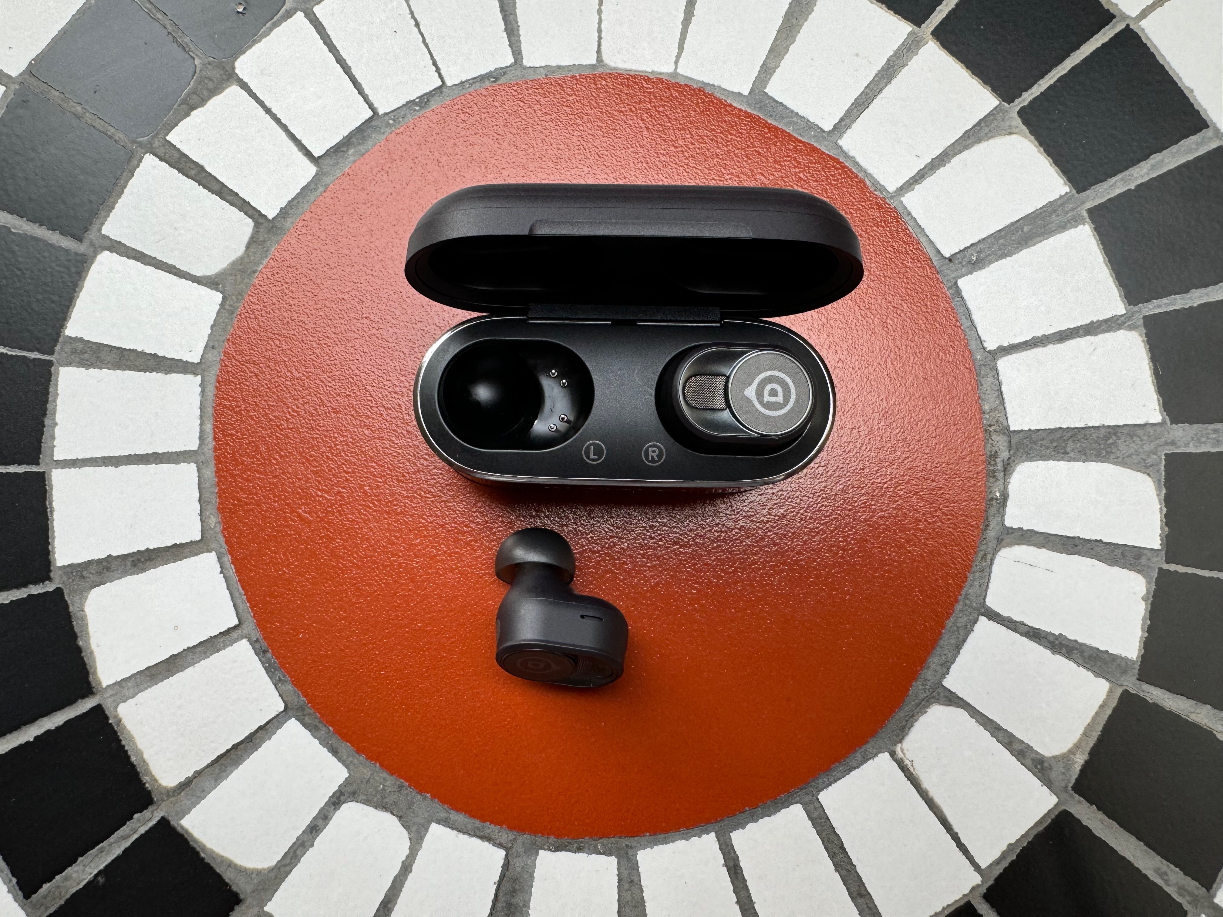 The carrying case is quite compact and works like a standard battery case for wireless earbuds, such as the cases of the Apple AirPods Pro, Bose QuietComfort earbuds and Sony WF-1000XM5. There’s a magnetic lid at the top of the case that you can open and close whenever you need to pick up or store your earbuds.