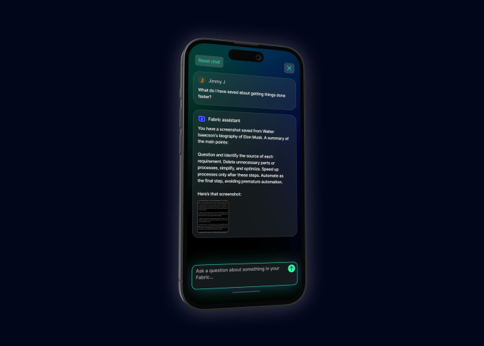 Founded in 2022 by London-based software engineer Jonathan Bree, Fabric originally began as an idea to create a “multiplayer” collaborative web browser. That concept now lives on inside Fabric, as users can create dedicated shared spaces where they can collaborate on documents together and chat. For example, the spaces could be used to share project files, plan a trip together, gather inspiration, review a design, and more, the company suggests, which has some similarities to the web browser Arc’s shared folders and spaces.