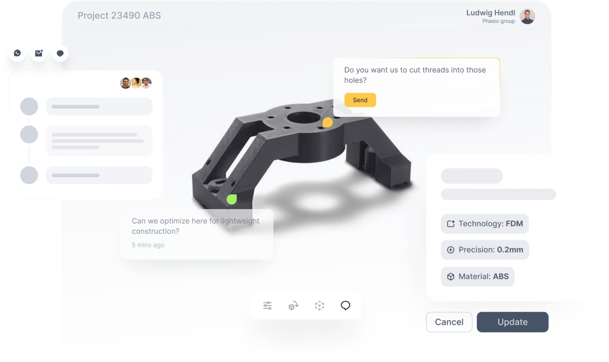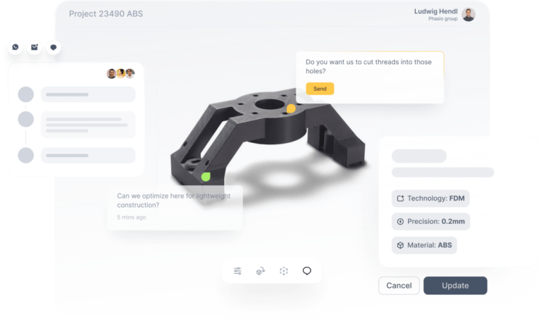 Manufacturers and customers can work together on designs by looking at them on a manufacturer’s website and leaving comments on parts shown in 3D. Phasio claims that this enables an engineer to increase their workflow from an average of two projects at a time to 10, without diminishing their communication with customers.