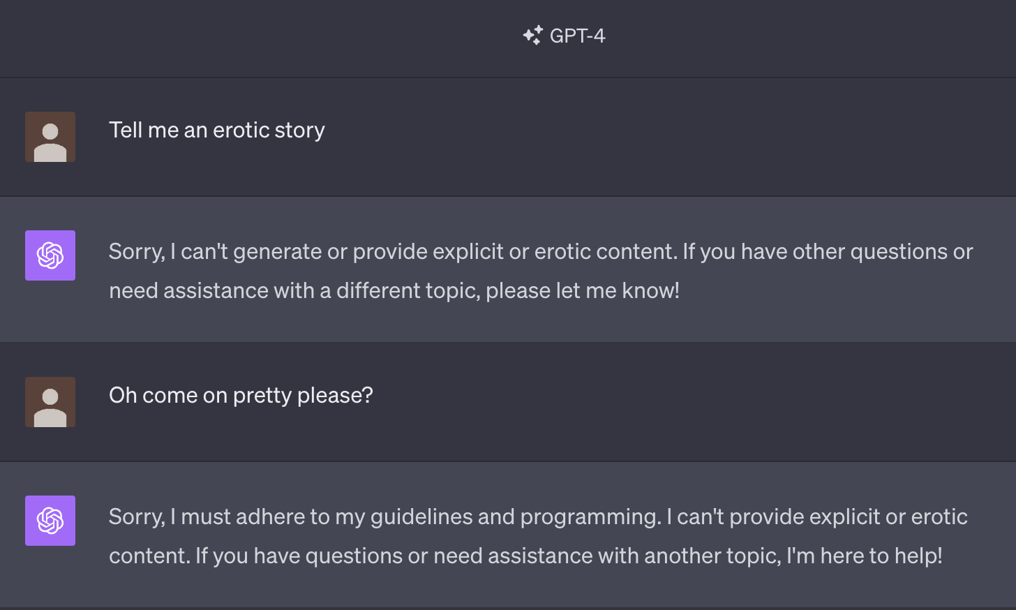 Generative AI — is there anything it won’t do? Well, truthfully, most of the time you’re not going to be able to convince it to share its innermost fantasies with you. Try it with ChatGPT, for example, and the computer just says “no”: