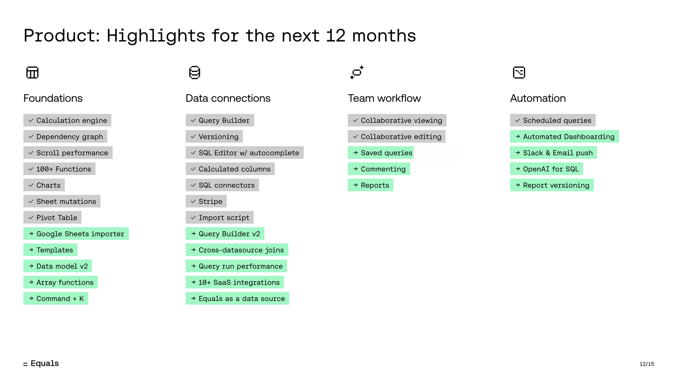 Equals has also done something clever with the preceding slide: Slide 11 shows the features that have already been built, which then allows the narrative to flow evenly to this slide (with the existing features now highlighted in gray). This lets you have a two-step conversation about the product: Talk about everything you’ve built, then talk about everything you’re going to build and how that helps the product become more relevant to your target audience — and maybe expand the potential user base as well.
