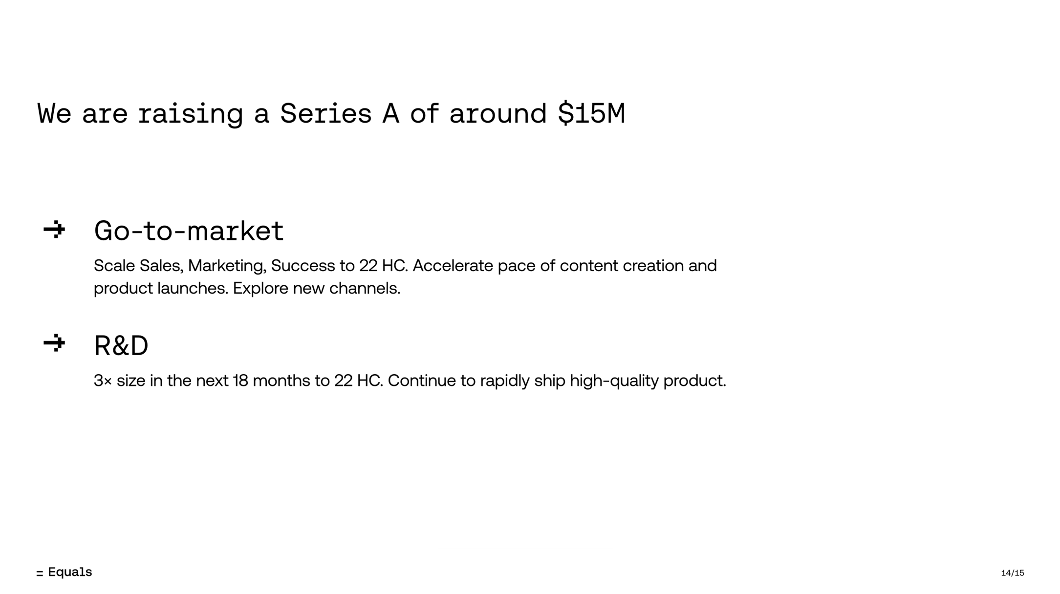 I know many founders stumble on this critical slide. Glamorous but unnecessary expenses, a nebulous abyss of “miscellaneous” costs, and vague descriptions of how the funds will be used are just a few common pitfalls that can turn investors away. Equals falls prey to such a trap: None of these goals are nearly specific enough. The slide should be as clear and detailed as possible, avoid generalizations, and focus on specific, measurable, achievable, relevant and time-bound (SMART) goals.