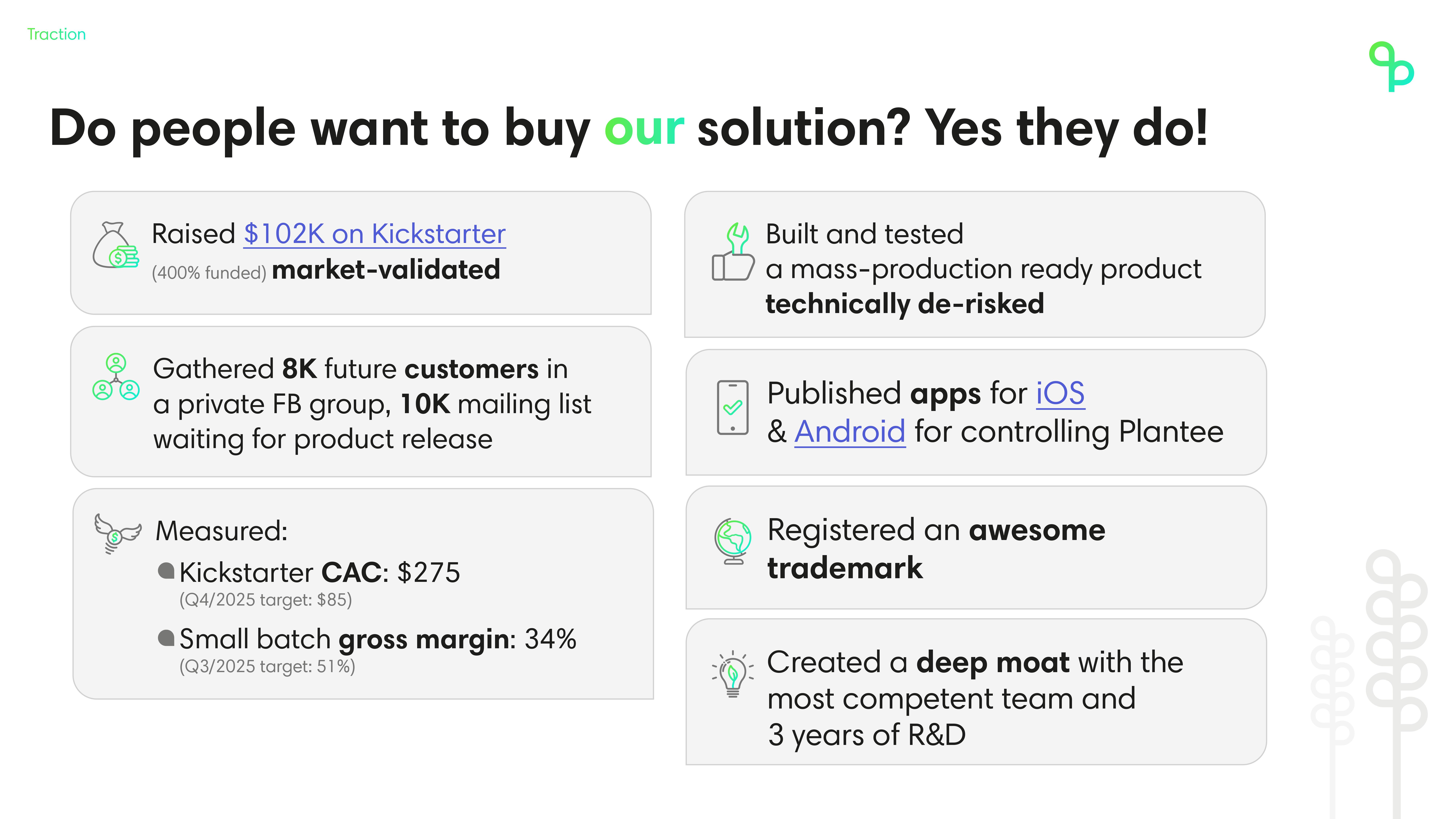 [Slide 11] Plantee is arguing front and center that its Kickstarter campaign is part of the market validation. But there’s a catch. Image Credits: Plantee