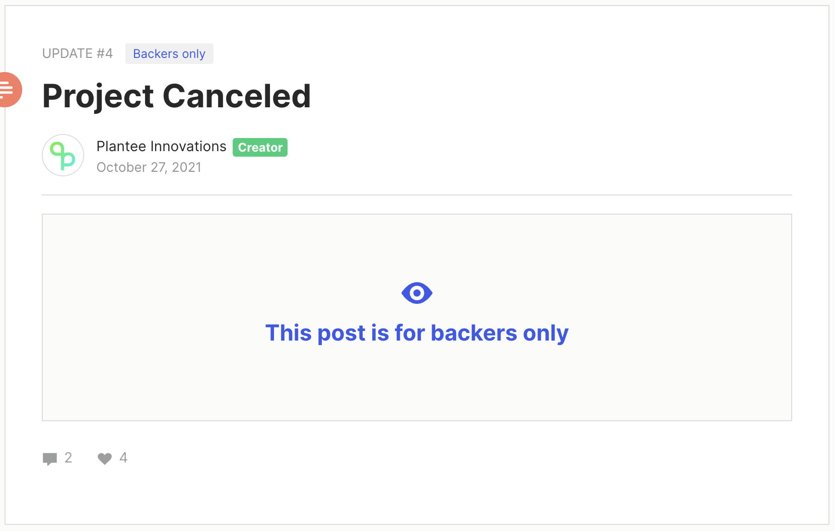Plantee did, in fact, persuade 109 backers to pledge just over $100,000 for its product. The campaign was fully funded in less than eight hours but was canceled just under a month later.