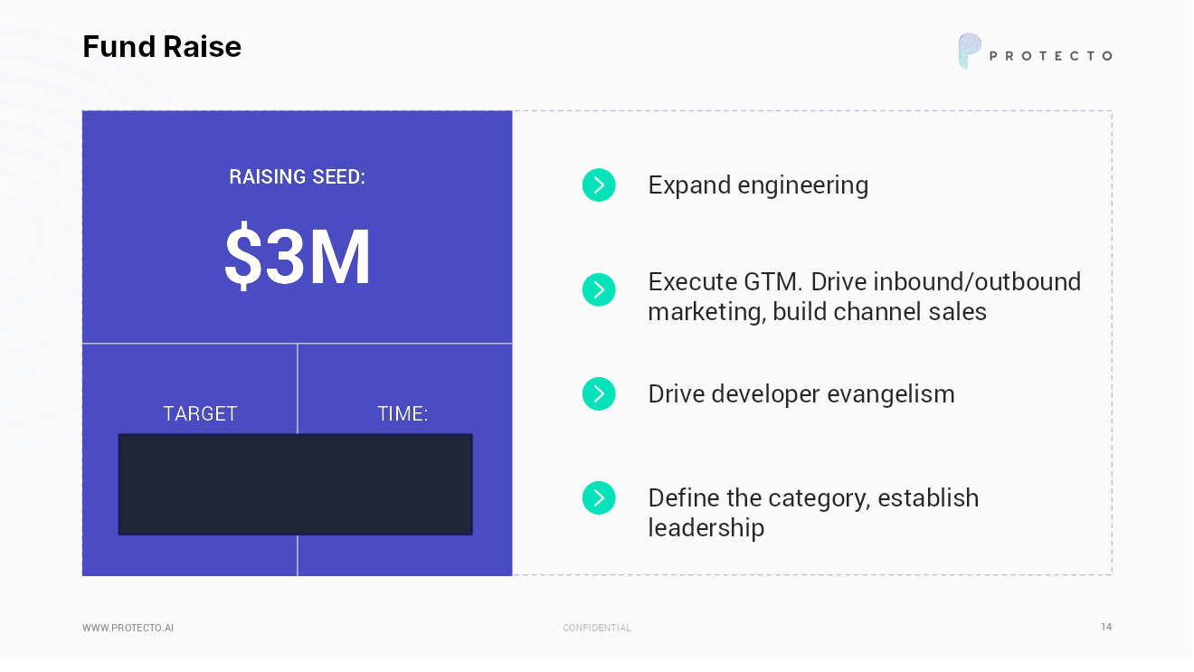 Protecto made redactions to the short-term and five-year goals and to specific details of the near-term product roadmap before submitting its deck to TechCrunch. The timeline for the goals and milestones related to the seed funding round was also redacted. Still, there’s plenty to learn from the 14-slide deck:
