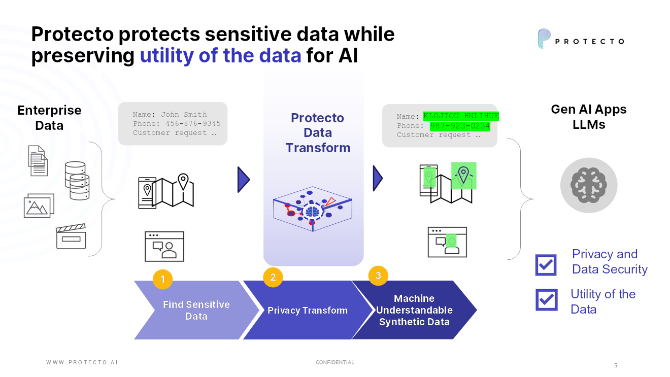 [Slide 5] Take sensitive, private data. Replace with similar, fake data. Makes sense to me. Image Credits: Protecto