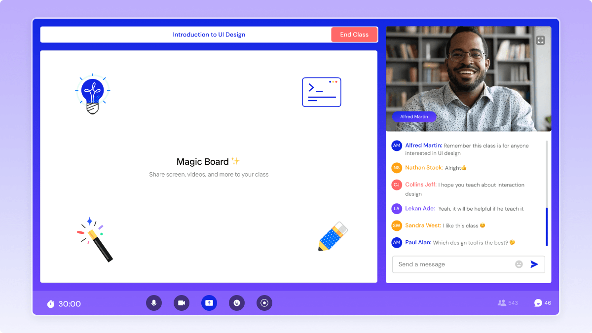 The platform offers essential class components such as scheduling, payments, community features, analytics, and video conferencing, catering to various subjects from coding and design to finance, art, and languages.