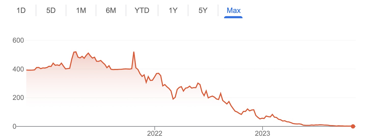 Shares of WeWork that once peaked at over $500 fell 99.8% to less than a $1.