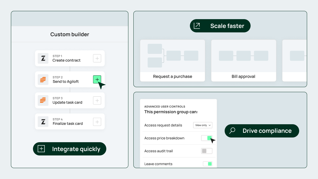 To make all of this easier, Zip today announced Zip Premier, a set of new enterprise capabilities, as well as a new low-code integration platform that allows its users to build their own integrations to tap into services that Zip itself doesn’t support with its existing connectors. And to make it easier to onboard new customers, Zip is also launching a set of 100 pre-built workflow templates today. These include templates for working with contractors, managing auto-renewals and vendor offboarding, for example.